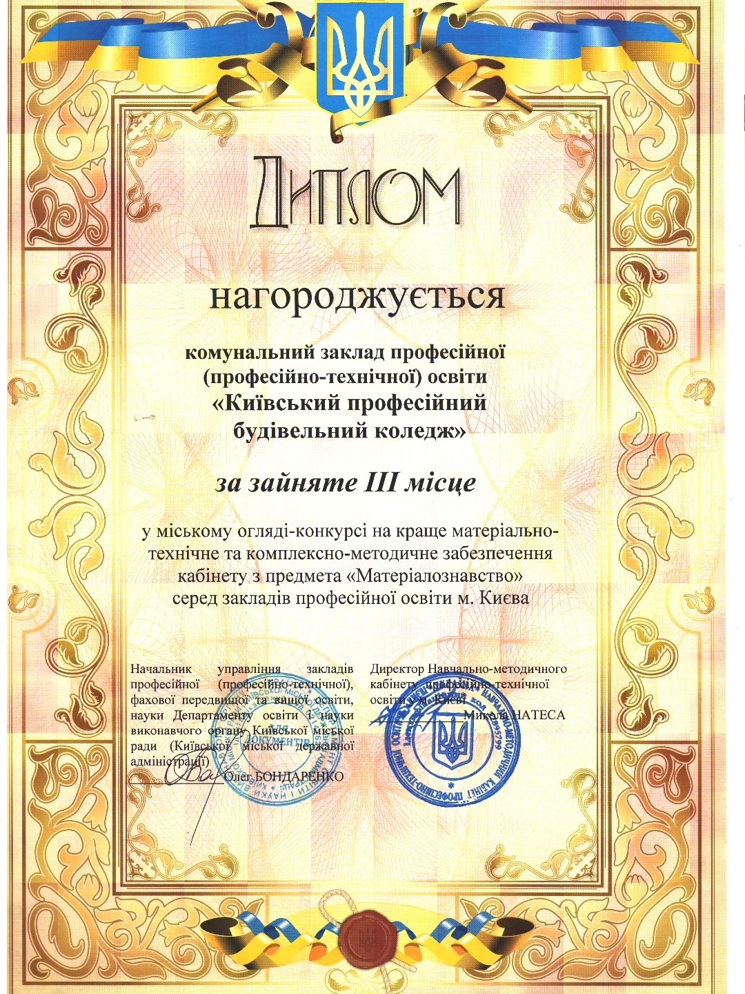 Завершився конкурс на кращий кабінет «Матеріалознавство», і наш кабінет посів 3 місце серед закладів професійної освіти міста Києва. Величезна подяка Анні Лагоді — викладачу професійно-теоретичної підготовки— за любов до справи, продуману організацію навчання й матеріали, з якими хочеться працювати. Радіємо, пишаємось і рухаємось далі.